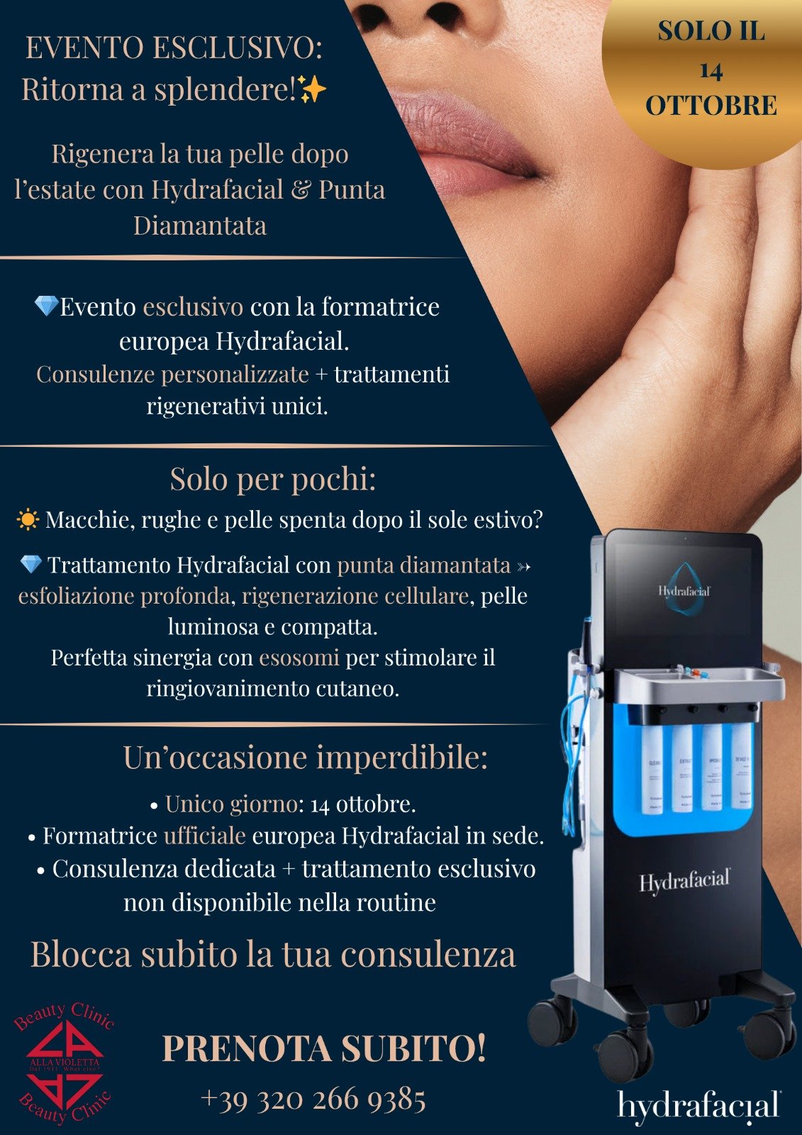 Solo il 14 ottobre, la nostra clinica ospiterà un evento esclusivo con la formatrice ufficiale europea Hydrafacial, per vivere un’esperienza di bellezza e rigenerazione mai vista prima.